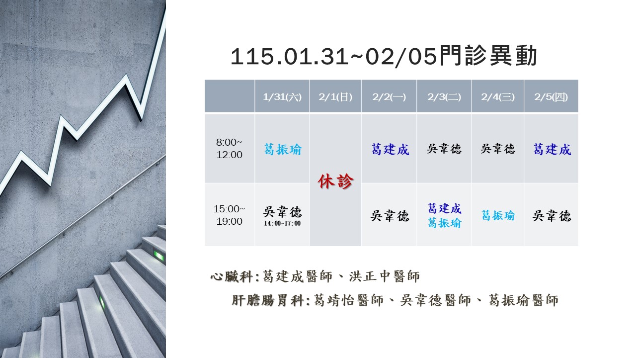 【門診異動公告】115/1/31(六)~2/5(四)門診異動