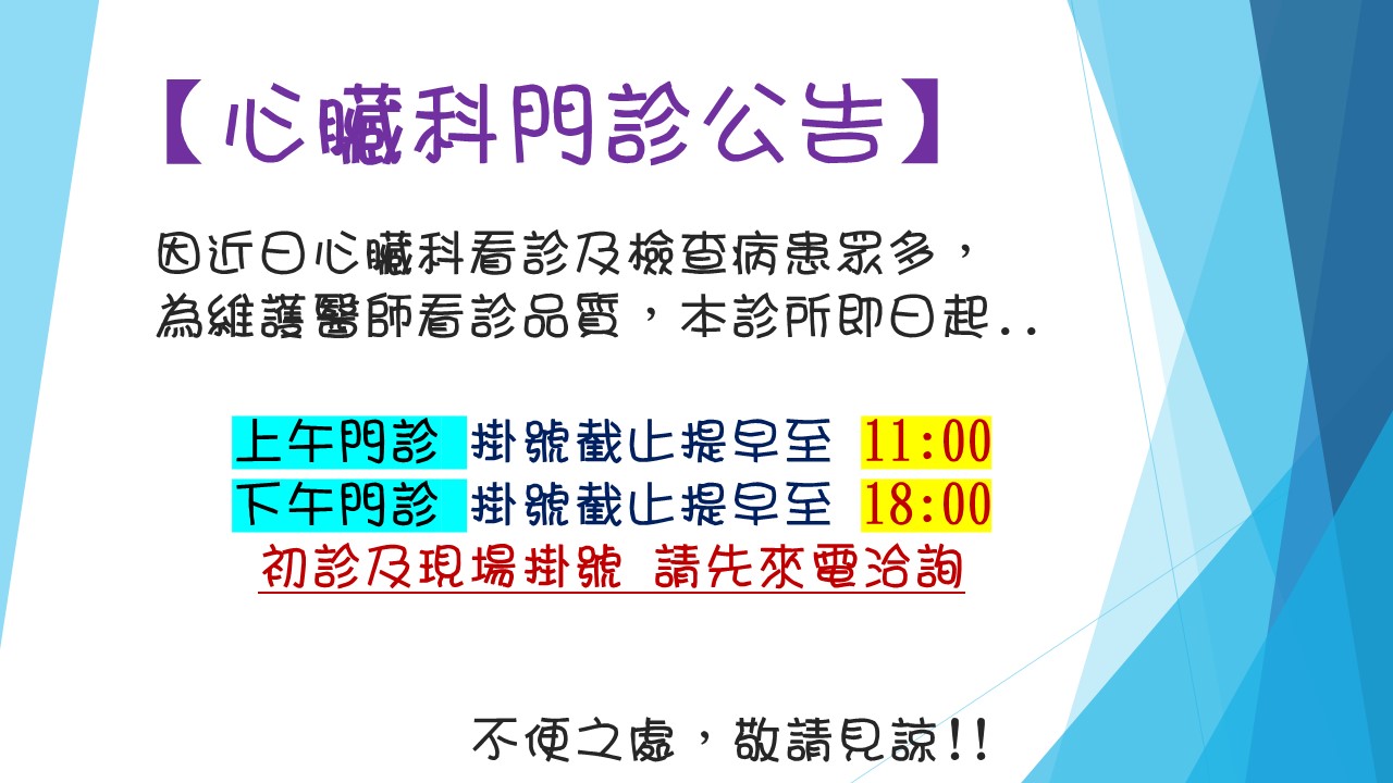 【心臟科門診公告】初診及現場掛號,請先來電洽詢~